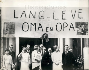 1.5.67 Queen Juliana Birthday Celebrations " Thousands of people gathered outside the Royal Palace of Soestdijk today, to greet Queen Juliana on the occasion of her 58th birthday celebrations. The QueenE™s birthday was yesterday (April 30), but being a Sunday, todayE™s ceremony was held over until today. Keystone Photo Shows: Standing below a banner saying Long Live Grandma and Grandpa), are members of the Dutch Royal Family; (L to R): Princess Christina; Mr. Pieter Van Vollenhoven; (husband of Princess Margriet); Princess Margriet; Prince Claus ( husband of Crown Princess Beatrix); Queen Juliana; Prince Bernard; Princess Irene and her husband, Prince Hugo.