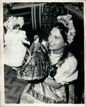 International Handicrafts Exhibition: The first International Handicrafts Exhibition ever held in Britain, opens tomorrow at Empire Hall, Olympia. A preview was held this afternoon. Photo shows Miss Edith Smookler, wearing Hungarian national costume, seen with two doll exhibits of the British Hungarian Friendship Society, on their stand at the exhibition today.