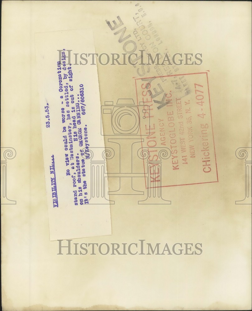 1953 Press Photo stand roof on statue of George Canning at Westminster