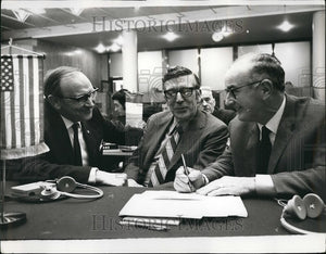 U.S. AND BRITISH UNION LEADERS MEET: Photo Shows:- Mr. Jack Jones (left), Transport Union general secretary; Mr. Leonard Woodcock, President of the Automobile Workers of America, and (right) Mr. Hugh Scanlon, Left-wing president of the Engineering Union, meeting at TUC headquarters in London yesterday before they left for talks with Mr. Heath at the Commons on the eight-week old Ford Strike.