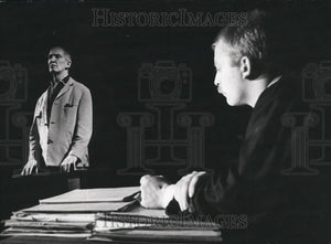 The first Performance: Of Peter Weiss' play "Die Ermittlung" (The proceedings) which is bases on the Auschwi tzprozeB will takes place at the same time in the Federal Republic of Germany and in the DDR, - on October 19th in Kottbus (East-Germany), Dresden (East-Germany), Erfurt (East-Germany), Leipzig (East-Germany), Alltenburg (East-Germany) Hale (East-Germany), Rootstock (East-Germany), Potsdam (East-Germany) Neutralize (East-Germany) and East-Berlin on the one side, as also in West-Berlin, Essen, Cologne and Munich on the other side. The defendants are taken over in the play with the original names of the proceedings, Mulka, Bogner, Dr. Capesius a.s.o. The Royal Shakespeare Theatre appears the play also on October 19th in the English language. Photo shows The defendant Mulka and his advocate during the rehearsals in Cologne under the direction of Joachim Muhsam (Mula =Gustav Schellhardt).