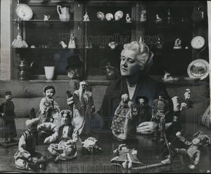 1956 Press Photo Mrs Aaron w/ her collection of dolls dressed in National Dress