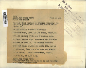 Fred Gerlinger and Joe Cozzo, sightless boys and members of Chicago's Unusual Blind Boy Scout Troop, read volumes of the Boy Scout handbook in Braille. The Braille handbook comprises seven volumes and costs $20, instead of 50 cents. Eighteen blind boys are members of the troop. Their scoutmaster, Fred F. Colotin, 53, is also blind.