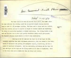 The Super Cub 95 has an approved weight carrying capacity equal to that of a 31/2 passenger airplane. The front seat is larger and more comfortable than formerly and may be adjusted in height for maximum comfort and visibility. The latter is especially important in student instruction. The sliding window on the left and the wide door on the right greatly facilitate taking aerial photographs. The Easymait swinging engine mount is a boon to easy maintenance. Carrying on the Cub name are the Super Cub 95 and Super Cub 105 Outwardly appearing like their well known predecessors, they are powered by the Continental 90 horsepower and Lycoming 108 horsepower engines, respectively and have a number of important refinements. Each has outstanding performance and the Super Cub sets new highs in both high and low flying speeds in its class of lightplane. Seats in the roomy cabin are in tandem but they are larger and roomier.
