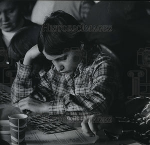 1974 Press Photo Margie Kornhoff concentrated on two cards - mja06349