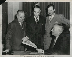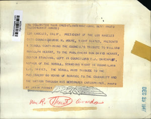 President of the Los Angeles City Council George H. Moore, right seated, presents a scroll containing the council's tribute to William Randolph Hearst, to the publishers son David Hearst, center standing. Left is councilman EJ Davenport, author of the scroll. Standing right is councilman LG Davies. The scroll pays tribute to the publishers 60 years of service to the community and the nation through his newspaper enterprises.