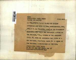 Attentive and with serious countenances, Mrs. Philip F. La Follette, wife of the Wisconsin governor, and their two children, listen to the Madison, Wis., speech of the governor April 28, when he announced the birth of a new National Political Party to be known as the National Progressives of America