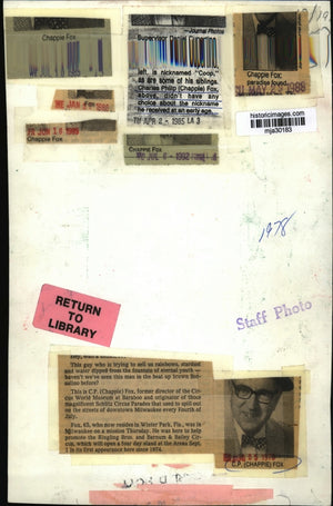 Chappie Fox This guy who is trying to sell us rainbows, stardust and water dipped from the fountain of eternal youth -- haven't we've seen this man in the beat up brown Borsalino before? This is C. P. (Chappie) Fox, former director of the Circus World Museum at Baraboo and originator of those magnificent Schlitz Circus Parades that used to spill out on the streets of downtown Milwaukee every Fourth of July. Fox, 65, who now resides in Winter park, Florida, was in Milwaukee on a mission Thursday. He was here to help promote the Ringling Brothers and Barnum and Bailey Circus, which will open a four day stand at the Arena September 1 in its first appearance here since 1974.