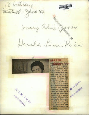 Mary Alice Jones and Harold Louis Kuhn will be married at 1:45 p.m. Saturday at Old St. Mary's Catholic church. A reception will follow at the University club. The bride of Mr. and Mrs. Raymond W. Jones, 2422 E. Newberry blvd. made her debut at an informal tea at the Woman"s Club of Wisconsin. She attended Lindenwood college, St. Charles, Mo. Kuhn son of Mr. and Mrs. Arthur Kuhn, Trenton, Ill., is an alumnus of Dayton (Ohio) university and attended the graduate school of St. Louis (Mo.) university. He was a peace corps. volunteer from 1965 to 1967. The couple will live in Trenton.