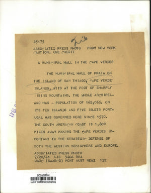 The municipal hall of Praia on the island of San Thiago, Cape Verde Islands, sits at the foot of sharply rising Mountains. The whole archipelago has a population of 162,065. On its ten islands and five islets Portugal has governed here since 1570. The South American coast is 1.600 miles away making the Cape Verdes important to the strategic defense of both the Western Hemisphere and Europe.