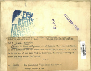 Robert C. Zimmerman, above, 46, of Madison, Wis., has announced he is a candidate for the Republican nomination as secretary of state. He is the son of the late Fred R. Zimmerman, Wisconsin secretary of state for many years.