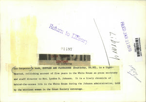 Liz Carpenter's book, "Ruffles and Flourishes", is a light-hearted, rollicking account of five years in the White House as press secretary and staff director to Mrs. Lyndon B. Johnson. It is a lively chronicle of behind-the-scenes life in the White House during the Johnson administration, told by the wittiest woman in the Great Society entourage.