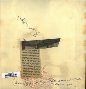 The desk, first appraised as a $20,000 antique of the early 19th century, will be removed from the White House and returned to its donor because of doubts of its age. Sue Hortensen of the White House is shown with the desk. The desk, a gift of Mrs. Maurine Noun of Des Moines, Iowa, was one of Mrs. Jacqueline Kennedy's treasured acquisitions in her redecoration of the White House. It was displayed on the first lady's televised tour of the White House last February. Washington DC - White House - Interior - Antiques