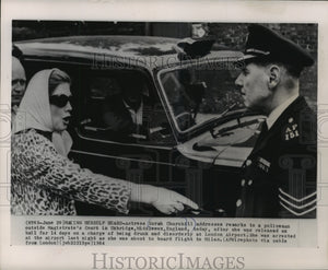 Making herself heard - Actress Sarah Churchill addresses remarks to a policeman outside Magistrate's Court in Uxbridge, Middlesex, England, today, after she was released on bail for 14 days on a charge of being drunk and disorderly at London Airport. She was arrested at the airport last night as she was about to board flight to Milan. 1964