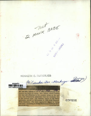 Mr. and Mrs. Edison of 101 N. 100th st. are pleased to announce the birth of a baby. Mrs. Edison, shown holding her day old offspring in the monkey house at the new zoo. was temporarily separated from her husband, who is the curious type. The Edisons, native to the Malay peninsula, moved to Milwaukee in 1959 from Hanover. West Germany. The baby spectacled langur is "doing real well." according to Robert Bullerman. assistant director of the zoo.