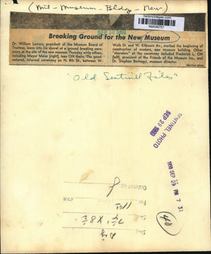 Breaking Ground for the new museum: Dr. William Lamers, president of the Museum Board of Trustees, leans into his shovel at a ground breaking ceremony at the site of the new museum Thursday while others, including Mayor Maier (right), lean on theirs. The good natured, informal ceremony on N. 8th Street, between W. Wells Street and W. Kilbourn Avenue, marked the beginning of construction of modern, new museum building. Other "shovelers" at the ceremony included Frederick L. Ott (left), president of the Friends of the Museum Incorporation, and Dr. Stephan Borhegyi, museum director.