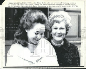 Julie Nixon looks like the proverbial blushing bride as she arrives at Marble Collegiate Church for Sunday services accompanied by her mother, Mrs. Pat Nixon, 12/22. Julie weds David Eisenhower at the same church later 12/22. David Eisenhower and wife-wedding