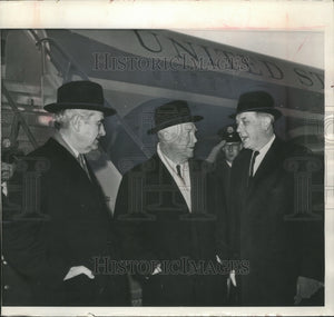 Secretary of State Rusk (right), a member of the official United States delegation to the funeral of Sir Winston Churchill, chatted planeside Thursday with two privately invited guests, former president Dwight D. Eisenhower and Undersecretary of State W. Averell Harriman, a former ambassador to Great Britain. The group left from Andrews air force base near Washington on the flight to London.
