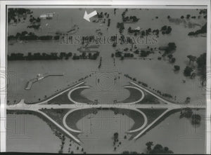 Floodwaters have covered much of this cloverleaf intersection north of Topeka, Kansas. The Owl park baseball grounds indicated by the arrow. Only the roof of a motel (left, center) remained above the water.