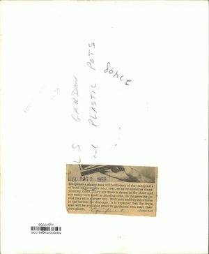 Inexpensive plastic pots will hold many of the transplants offered to gardeners next year, so as to minimize transplanting shock. They are made a dozen to the sheet and are easily torn apart at planting time. In the growing period they sit in a larger tray. Both pots and tray have holes in the bottom for drainage. It is expected that the trays also will be available retail to gardeners who start their own plants. Gardens - Equipment.