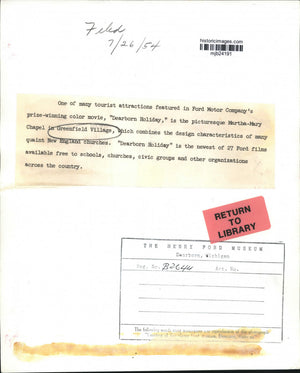 One of many tourist attractions featured in Ford Motor Company's prize-winning color movie, "Dearborn Holiday," is the picturesque Martha-Mary Chapel in Greenfield Village, which combines the design characteristics of many quaint New England churches. "Dearborn Holiday" is the newest of 27 Ford films available free to schools, churches, civic groups and other organizations across the country.