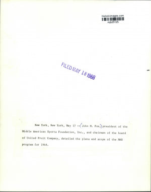 New York, New York, May 17--John M. Fox, president of the Middle American Sports Foundation, Incorporated, and chairman of the board of United Fruit Company, detailed the plans and scope of the MAS program for 1968.