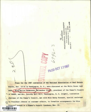 Plans for the 1967 convention of the National Association of Real Estate Boards, November 10-16 in Washington, D.C., were discussed at the White House last week. Miss Marion Rasmussen, Milwaukee (left),president of the Women's Council of National Association of Real Estate Boards (NAREB), and Mrs. Dorothy Bell Hill, Washington, D.C. (right), convention chairman of the Women's Council, met with Miss Betty Furness, special assistant to President Johnson on consumer affairs, to formalize arrangements for Miss Furness' speech at a Women's Council luncheon, Novermber 15.