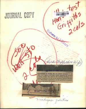 Hicks Griffiths and wife-Michigan politics: (WX1) Washington, D.C., August 23--Helps Write Tax Program--Representative Martha W. Griffiths, D-MI, the only female member of the House and Means Committee, which shapes the nation's federal tax structure. Mrs. Griffiths uses Treasury and Internal Revenue reports in reaching her decisions on which provisions of the administration's tax bill to back, during its present revision.