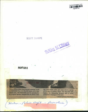 Police Officer Mike King handed baseball cards to Nahmelah Fox, 4, in the 500 block of West Wisconsin Avenue, after Nahmelah and her grandmother, Virginia Games, stopped him on patrol Tuesday. Each week police give away one in a series of 15 sets of trading cards. The two-card sets feature the Milwaukee Brewers with a crime prevention message on the back. (Milwaukee - Police Department - Promotion). Wisconsin.