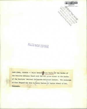 Major General Bruce Easley of the Garden of the Patriots Advisory Board with the 8th prize winner in the Garden of the Patriots' National Collegiate Sculpture Contest. The sculpture of Alan Shepard was done by Leroy Paulsen of Layton School of Art, Wisconsin.