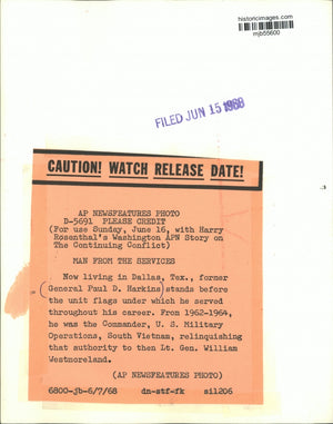 Man from the services. Now living in Dallas, Texas, former General Paul D. Harkins stands before the unit flags under which he served throughout his career. From 1962-1964, he was the Commander, United States Military Operations, South Vietnam, relinquishing that authority to then Lt. General William Westmoreland.