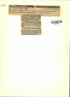 Troy Olsen-Wais, front left, is home again with his parents, John and Kimberly, back, and his brother Andy, 11, and sister Tina, 8. The gangly 10-year-old returned home just a week ago, after spending 12 weeks in the hospital for treatment of serious injuries he suffered in late September in an accident. The vigil started September 22, when Troy was hit by a car while bicycling across Pioneer Road near his home. He was on the way to schoolmate's house.