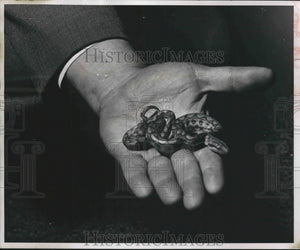 One of the zoo's baby Boa Constrictor snakes wiggled in the hand of George Speidel, zoo Director. It is less that a foot long. When full grown, it will be about 10 feet or more. Milwaukee-Zoo-Snakes.