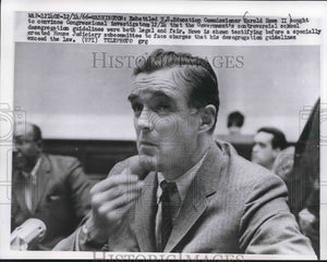 Washington DC; Embattled U.S. Education Commissioner Harold Howe II sought to convince Congressional investigators 12/14 that the Government's controversial school desegregation guidelines were both legal and fair. Howe is shown testifying before a specially created House Judiciary subcommittee to face charges that his desegregation guidelines exceed the law.