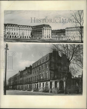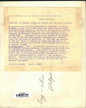 An American and British Commonwealth students' residence, planned to have over 1,000 rooms and cover some 17 acres on Mecklenburgh Square in the London borough of Bloomsbury, near the London University, is the main project to be financed by Britain's recently launched National Thanksgiving Fund. Designed to show the country's gratitude for the 75,000,000 food parcels received from overseas since the outbreak of World War II, the fund was started by the Lord Mayor of London to raise the equivalent of $5,600,000 through nation-wide contributions and the sale of special stamps. Pictures shows: TOP: An artist's drawing of a part of the planned overseas students' residence on the North side of Mecklenburg Square. Left, part of the proposed $2,240,000 building to house women and married students, Right, part of an existing Georgian terrace as it will... England - cities - buildings