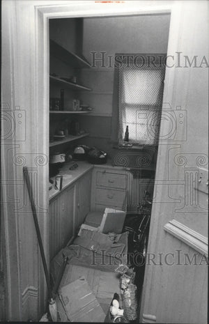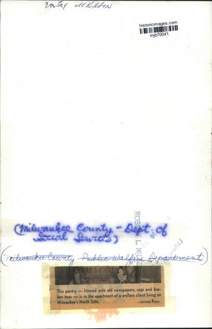 This pantry - littered with old newspapers, rags and broken toys- is in the apartment of a welfare client living on Milwaukee's North Side. Milwaukee County - Department of Social Services. Pantry off Kitchen.