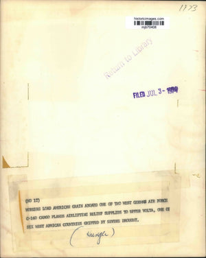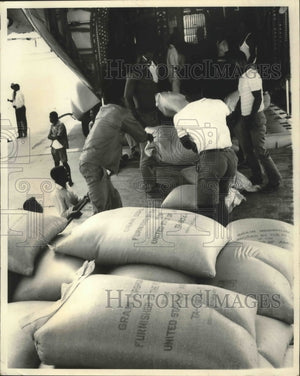 Workers load American grain aboard one of two West German Air Force C-160 cargo planes airlifting relief supplies to Upper Volta, one of six west African countries gripped by severe drought.