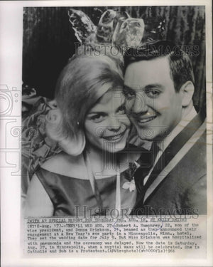 Robert A. Humphrey, 22, son of the vice president, and Donna Erickson, 21, beamed as they announced their engagement at New Year's eve party in a Minneapolis, Minn., hotel. They set the wedding date for July 9. But Miss Erickson was hospitalized with pneumonia and the ceremony was delayed. Now the date is Saturday, Aug. 27, in Minneapolis, when a nuptial mass will be celebrated. She is Catholic and Bob is a Protestant.