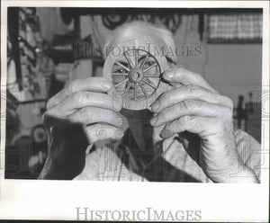 1966 Press Photo Harry Simonar of Glendale, Wisconsin makes model wagons