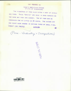 The fishermen of Peru also catch a host of edible seafood. These "Bonita" are sold in open markets on the same day they are caught. Two of them can be purchased for as little as 25 cents. The waters off the coast also abound in various types of shellfish. Peru, industry, occupations.
