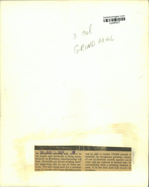 An autogenous grinding mill, said to be the largest ever produced, is being manufactured by Nordberg Manufacturing Company here. Workmen are shown welding exterior supporting ribs on one of three sections. The mill, being built for a uranium mine in Canada, will weigh 550,000 pounds and be able to handle 170,000 pounds of material. In autogenous grinding, chunks of ore or minerals tumble against each other and are reduced to desired size. In conventional mills a grinding medium is used. It is the first such mill made by Nordberg.