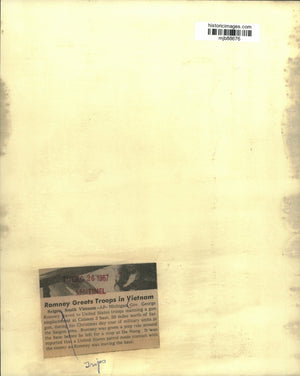 Romney Greets Troops in Vietnam - Michigan Governor George Romney waved to United States troops manning a gun emplacement at Caisson 3 base, 50 miles north of Saigon, during his Christmas day tour of military units in the Saigon area. Romney was given a jeep ride around the base before he left for a stop at Da Nang. It was reported that a United States patrol made contact with the enemy as Romney was leaving the base. Saigon, South Vietnam