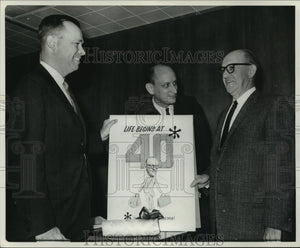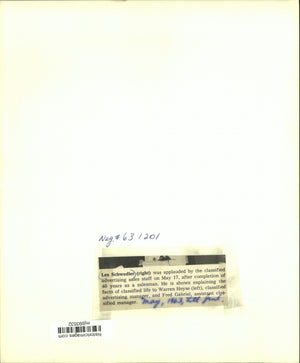 Lew Schwedler (right) was applauded by the classified advertising sales staff on May 17, after completion of 40 years as a salesman. He is shown explaining the facts of classified life to Warren Heyse (left), classified advertising manager, and Fred Gabriel, assistant classified manager.