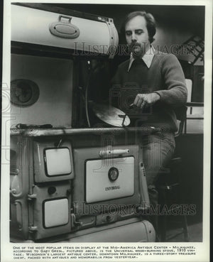 1982 Press Photo Gary Gresl and antique wood-burning stove, 1910-Milwaukee