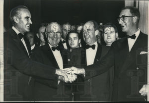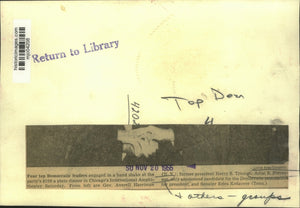 Four top Democratic leaders engaged in a hand shake at the party's $100 a plate dinner in Chicago's International Amphitheater Saturday. From left are Governor Averell Harriman (New York); former president Harry S. Truman; Adlai E. Stevenson, only announced candidate for the Democratic nomination for president, and Senator Estes Kefauver (Tennessee). Adlai E. Stevenson and Others - Groups.