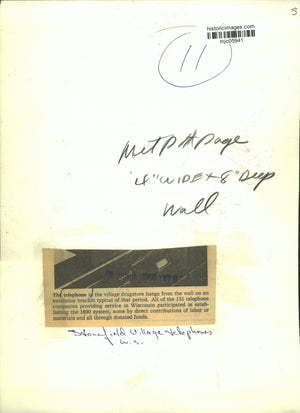The telephone in the village drugstore hangs from the wall on an extension bracket typical of that period. All of the 131 telephone companies providing service in Wisconsin participated in establishing the 1890 system, some by direct contributions of labor or materials and all through donated funds. (Sefonafield Village telephone W.S.)