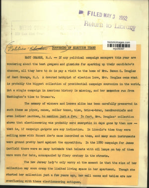 If any political campaign managers this year are wondering about the best gewgaws and gimmicks for sparking up their candidate's chances, all they have to do is pay a visit to the home of Mrs. Damon G. Douglas of East Orange, New Jersey. A devoted hobbyist of election lore, Mrs. Douglas owns what is probably the biggest collection of presidential campaign souvenirs in the world. Not a single campaign in American history is missing, and her mementos run from Washington's time to Truman's. The memory of winners and losers alike has been carefully preserved in such times as pipes, canes, collar boxes, ties, bric-a-brac, handkerchiefs and even ladies' panties, to mention just a few. In fact, Mrs. Douglas' collection shows that electioneering was probably more energetic in days gone by than now - that is if campaign gadgets are any indication. In Lincoln's time they were selling axes with Honest Abe's name inscribed in them, and many such instruments were ground pretty hard against the opposition. In the 1880 campaign for James Garfield there were so many hotheads that helmets with oil lamps on top of them were worn for hats, accompanied by fiery oratory in the streets. The New Jersey lady's only worry at the moment is that the size of her collection may soon cramp the limited living space in her apartment. Though she started her collection just a few years ago, her wall cases and tables are now overflowing with these electioneering antiques. (Politics - Souvenirs).