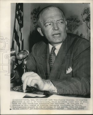 Harold Stassen, 44-year-old president of the U. of Pennsylvania, tells reporters today that he will seek the 1952 Republican nomination for president. He outlined the program he will pursue if elected, including insistence on "plain, old-fashioned honest in the officials of the nation, from the highest to the lowest."