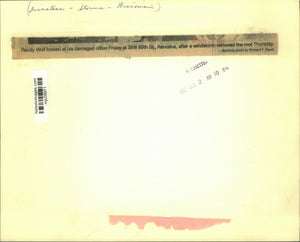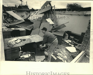 1987 Press Photo Randy Wolf assesses damage at office in Kenosha after windstorm