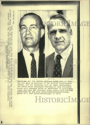 CIA (Central Intelligence Agency) Switch -- Richard Helms, left, is leaving his post as director of the Central Intelligence Agency, and his successor will be James Schlesinger, the White House announced Thursday. It said President Nixon will nominate Helms as ambassador to Iran. James R. Schlesinger.
